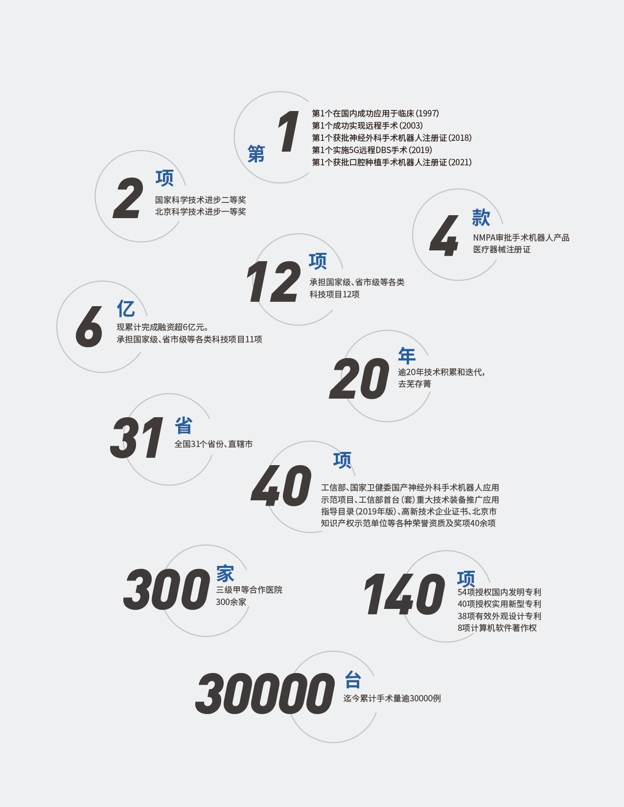 ·2019年與首都醫科大學宣武醫院、首都醫科大學附屬北京天壇醫院、中日友好醫院等9家牽頭醫院,共同承擔國家工信部、衛健委神經外科手術機器人應用示范項目,構建國內首個神經外科手術機器人醫企創新協同平臺。